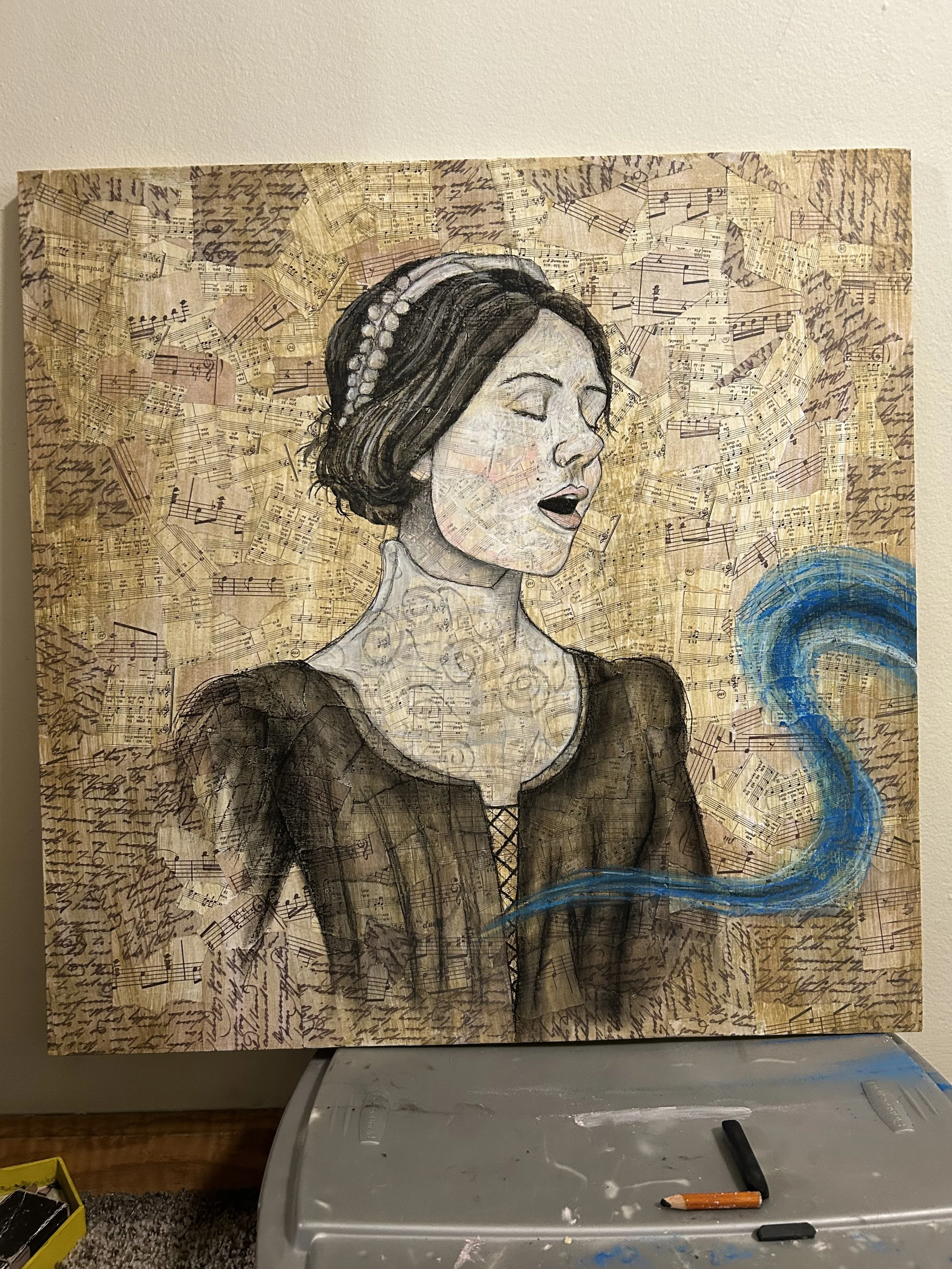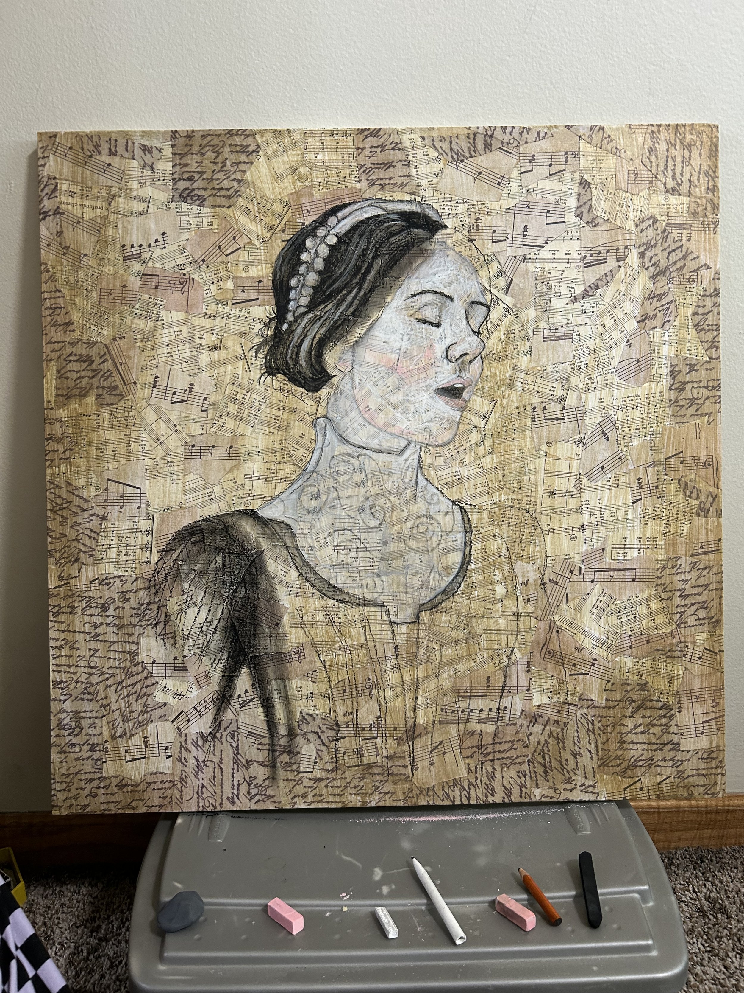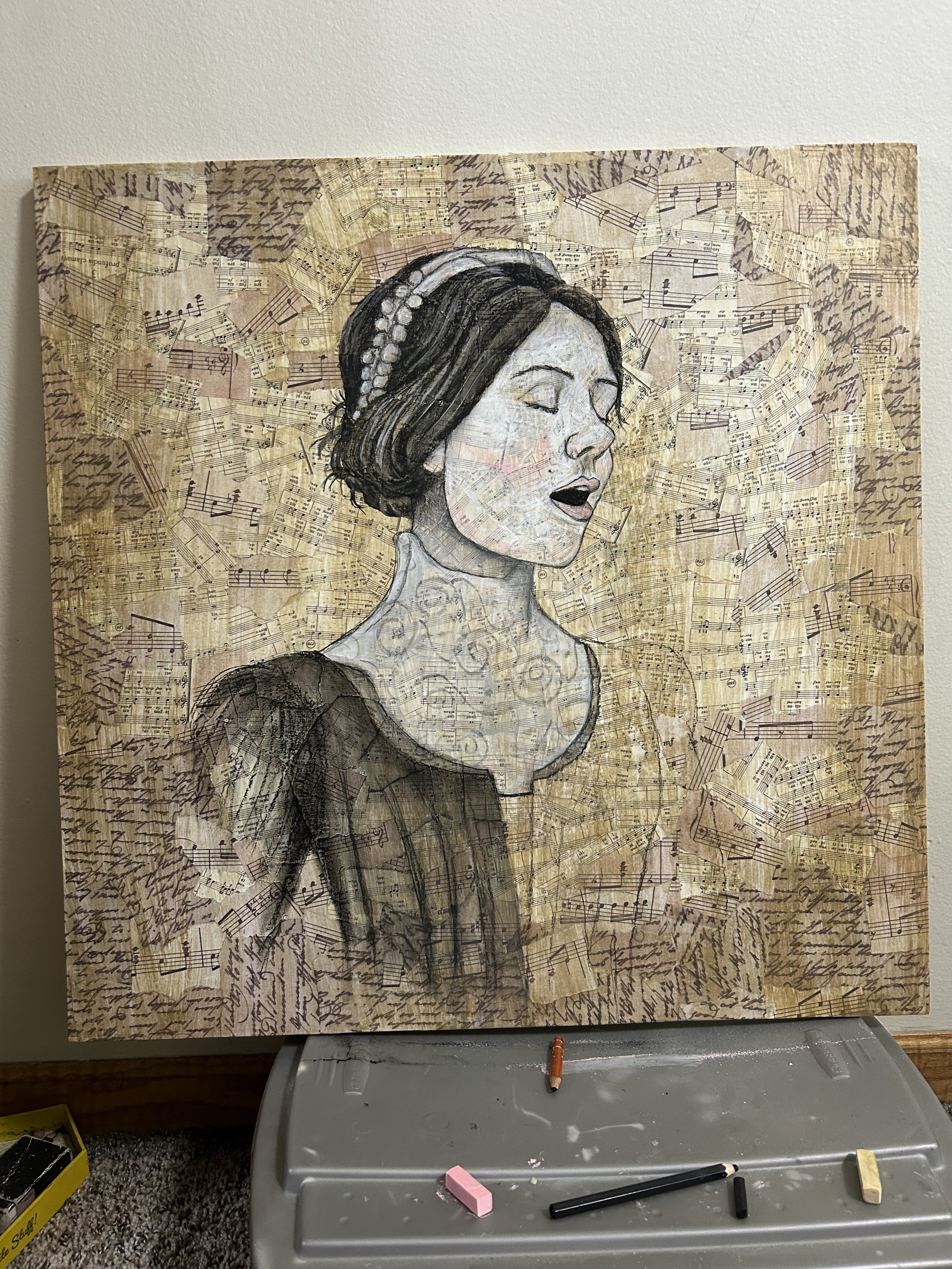 With the prepared surface ready, I began the image using a charcoal outline to map her form, then layered in soft conté crayon for warmth and depth. Her eyes are closed, holding the sound inside for just a moment longer.