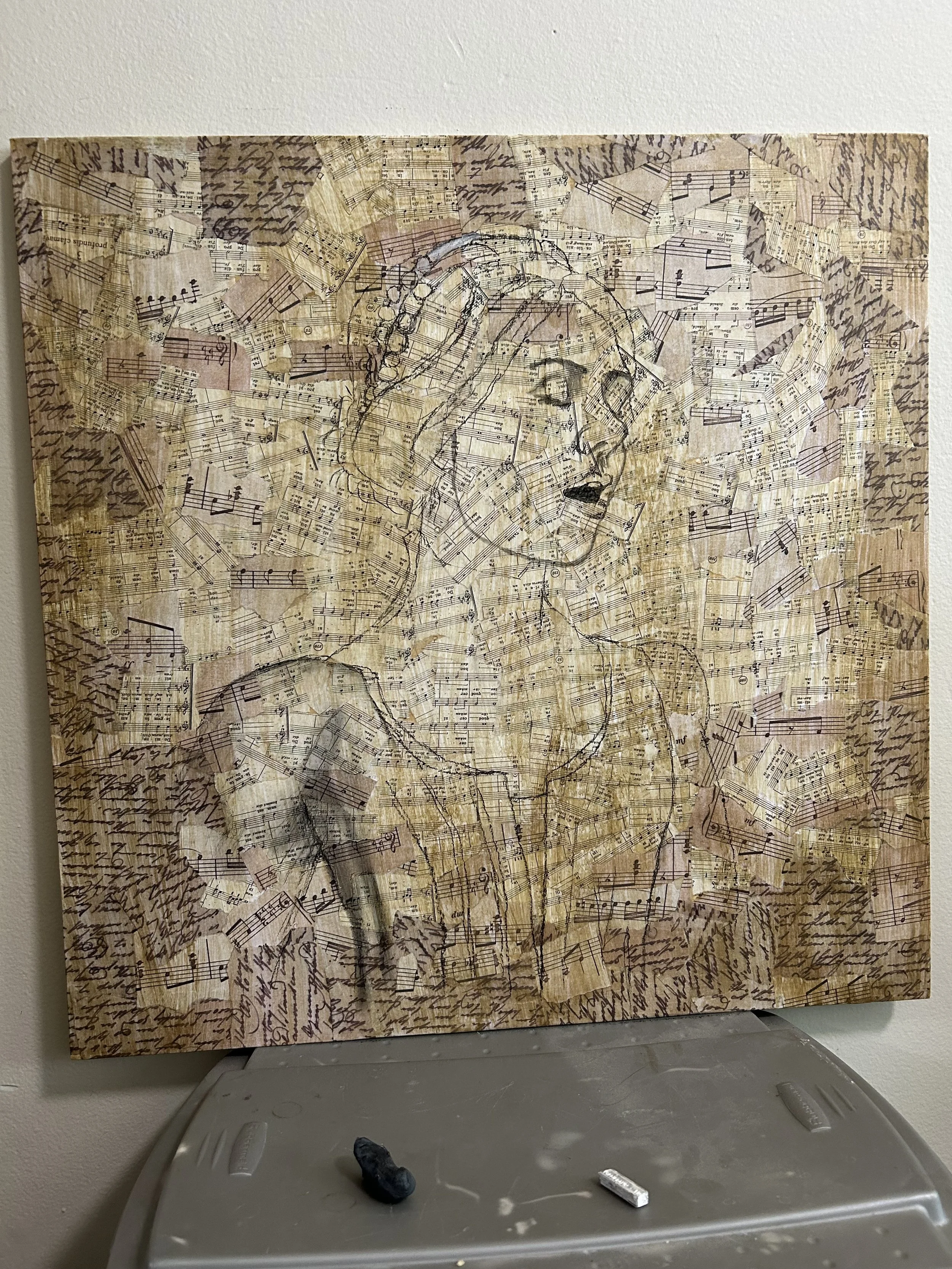The panel itself was weatherproofed with a layer of polyethylene, a necessary step since the finished piece will spend several weeks displayed outdoors at the Minnesota Renaissance Festival. Once the music fragments dried in place, I brushed the surface with a thin acrylic wash, allowing the notes to peek through a muted, aged tone. A final coat of gel medium sealed the surface, giving me the perfect ground for the next stage: working in charcoal.