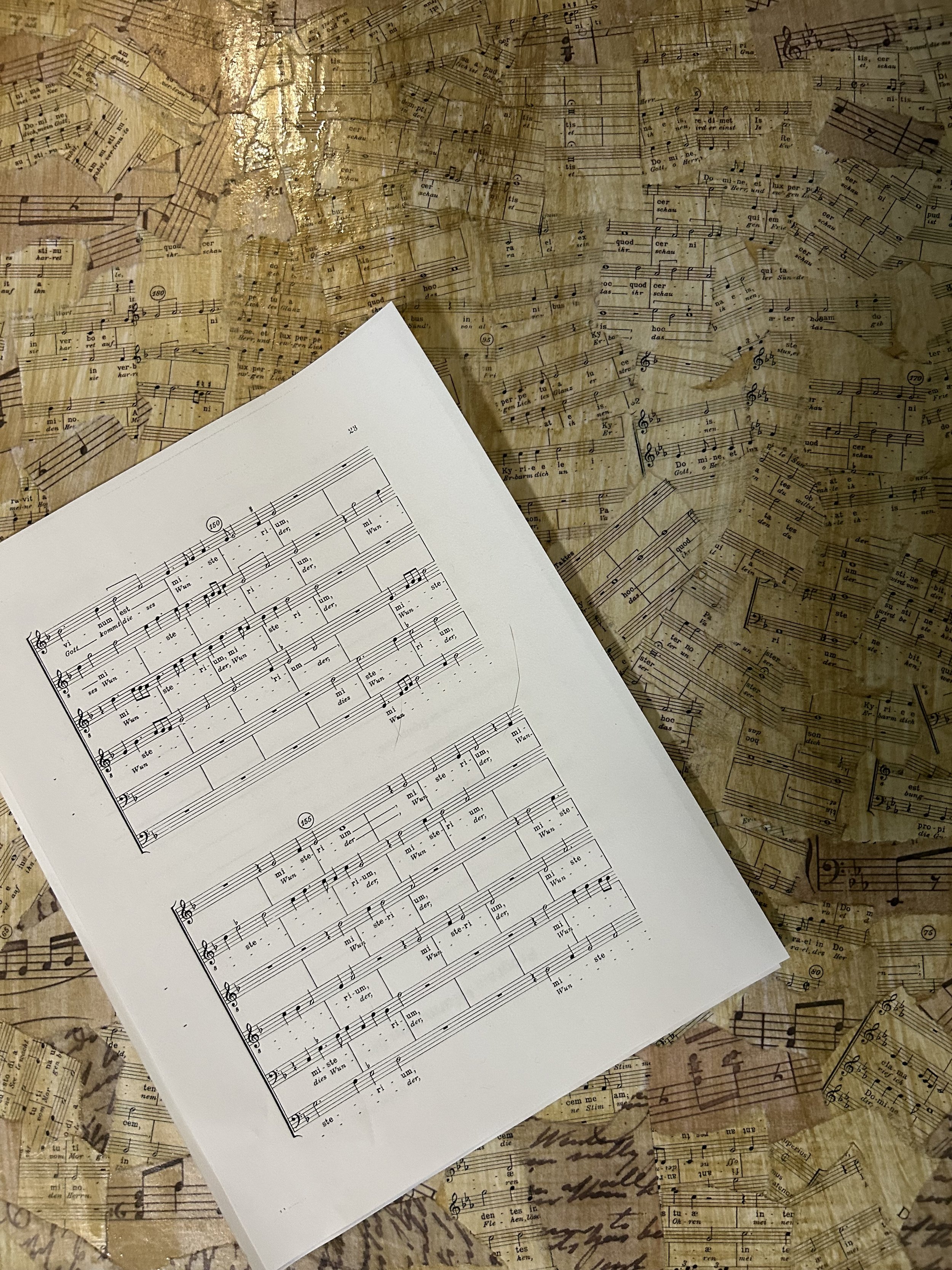 The first step in bringing Find Your Voice to life was setting the stage - quite literally - for the image to emerge. I began by printing period-appropriate sheet music, and handwritten script, the kind that might have drifted through a Renaissance hall. These pages were then torn into fragments, their edges softened and imperfect, and carefully adhered to a prepared panel.