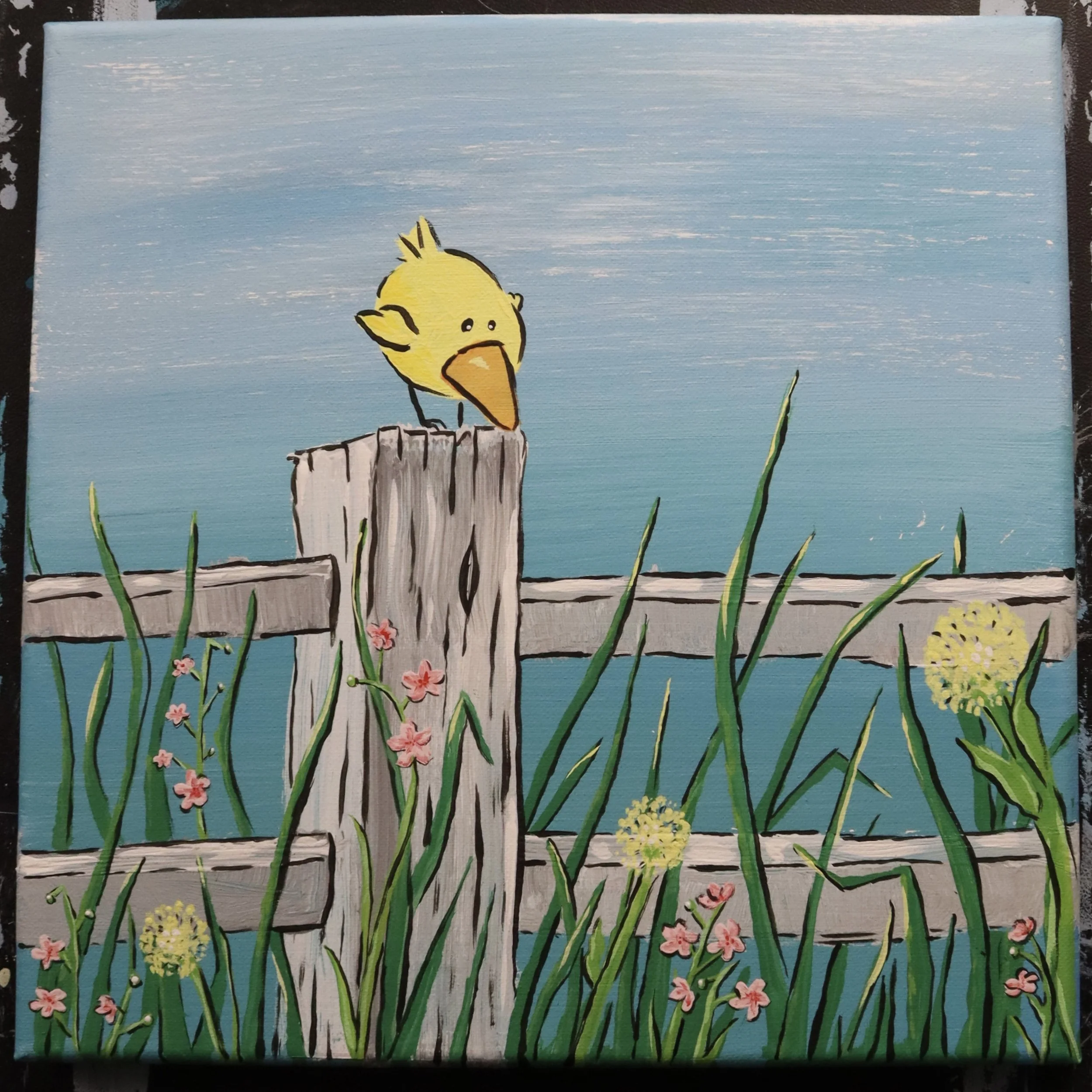 Create a bright and welcoming spring scene featuring a soft sky, wooden fence, blooming flowers, and a sweet garden bird. This project is designed for all skill levels and works beautifully for home painting, classrooms, libraries, and community art events.
